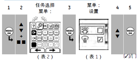 1. 从任务选择菜单中选择适用的压力任务 (表 2/3),如果有必要,调整设置 (表 1)和设定 (表 4/5)。