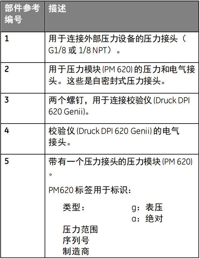 概述德鲁克压力校验仪根据功能有好几款,DPI 620是功能最全的一款,比起德鲁克DIP 611,DPI620的功能多了很多,它是一台由电池供电的仪表,用于电气测量与输出操作以及HART®通信。德鲁克DPI 620还为所有选件提供电源和用户界面功能。使用触摸屏最多可以显示六个不同参数。以下物品随Druck DPI 620 Genii 一起提供: 直流电源 锂聚合物电池 六条测试导线 交流探头 快速入门指南 触针 选件 以下物品是可与Druck DPI 620 Genii 一起使用的选件:压力模块支架MC 620,这用于直接连接到Druck DPI 620 Genii 以组成完全集成的压力测量仪表。 压力模块PM 620,这用于连接到压力模块支架(MC 620) 或压力站(PV 62X) 以增强压力测量功能。 压力站 PV 62X,如果将Druck DPI 620 Genii 安装在压 力站上,它将变为完全集成的压力校验仪。 一般安全注意事项 阅读并遵守所有操作人员的本地健康和安全法规及安全工作过程或实践。执行一个过程或任务时: 仅使用经核准的工具、耗材和备件以操作和维护设备 。 阅读并遵守所有适用的警告标志。 确保: 所有工作区都保持干净,没有不需要的工具 、设备和材料。 所有不需要的耗材都按照当地的健康和安全 及环境法规进行废弃。 基本模式1.11.1 打开电源 在关闭状态下,短时按住电源按钮直到显示屏闪烁( 参见:图 1-2)。 1.11.2 关闭电源 按住电源按钮直到屏幕为空。1.11.3 休眠模式 按下并释放电源按钮可进入休眠模式。1.11.4 从休眠模式启动 从休眠模式启动后,仪表将始终打开进入休眠模式之前显 示的最后一个屏幕。
